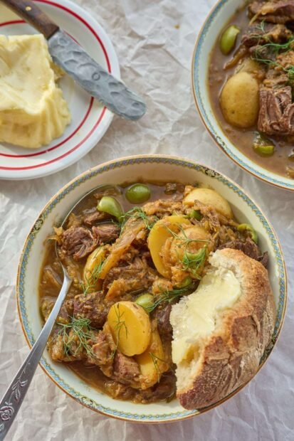 Recette de Navarin d'Agneau avec Spätzle Découvrez cette délicieuse recette de navarin d'agneau accompagné de spätzle, une spécialité allemande qui ravira vos papilles. Suivez nos étapes simples pour un plat réconfortant et savoureux. Instructions 1. Faire dorer l'agneau : Préchauffez le four à 150°C. Séchez l'agneau américain et assaisonnez légèrement avec du sel. Chauffez de l'huile dans une grande cocotte en fonte à feu moyen-vif. Faites dorer l'agneau par portions, en saisissant tous les côtés jusqu'à obtenir une belle couleur dorée. Retirez et réservez. 2. Cuire les oignons et les poivrons : Réduisez le feu à moyen. Ajoutez les oignons avec une pincée de sel et faites cuire pendant 10 à 15 minutes, en remuant souvent, jusqu'à ce qu'ils soient très tendres et légèrement dorés. Ajoutez les poivrons et continuez la cuisson pendant 5 minutes jusqu'à ce qu'ils soient ramollis. […]