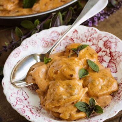 Raviolis au mouton américain et parmesan dans une crème de tomate