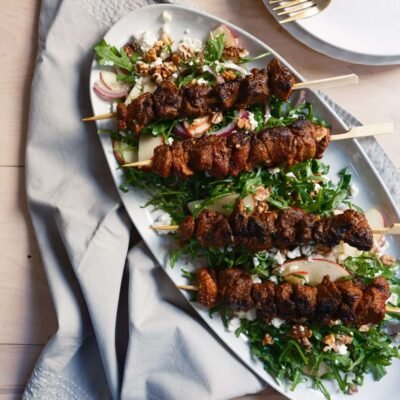 Kebabs d’agneau aux épices de citrouille avec salade de pommes et roquette