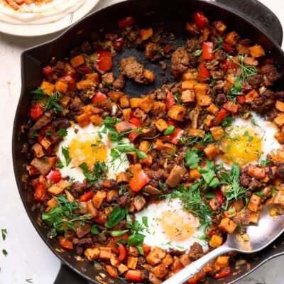 Gnocchis cuits au four dans une poêle avec de l’agneau américain et de la feta