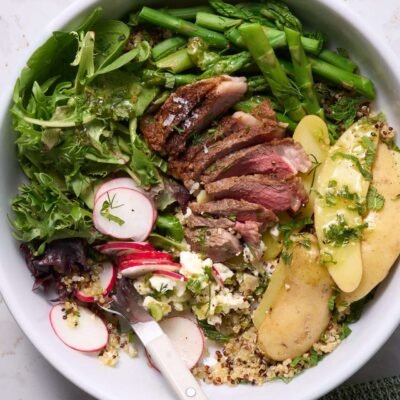 trending_flat Viande Bol de légumes de printemps avec des côtelettes de gigot d’agneau américain grillées.