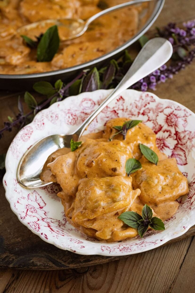 Raviolis au mouton américain et parmesan dans une crème de tomate