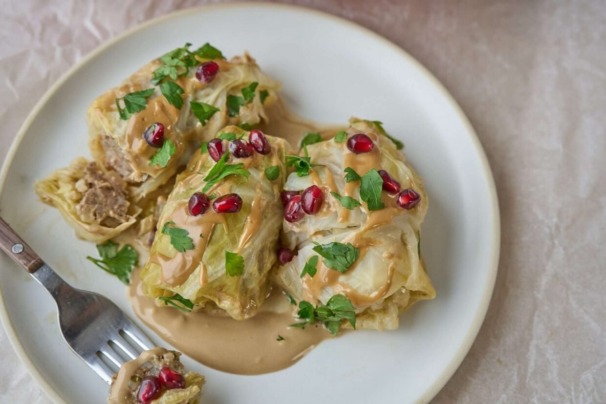 Roulés de chou au mouton épicé au cumin avec tahini et grenade