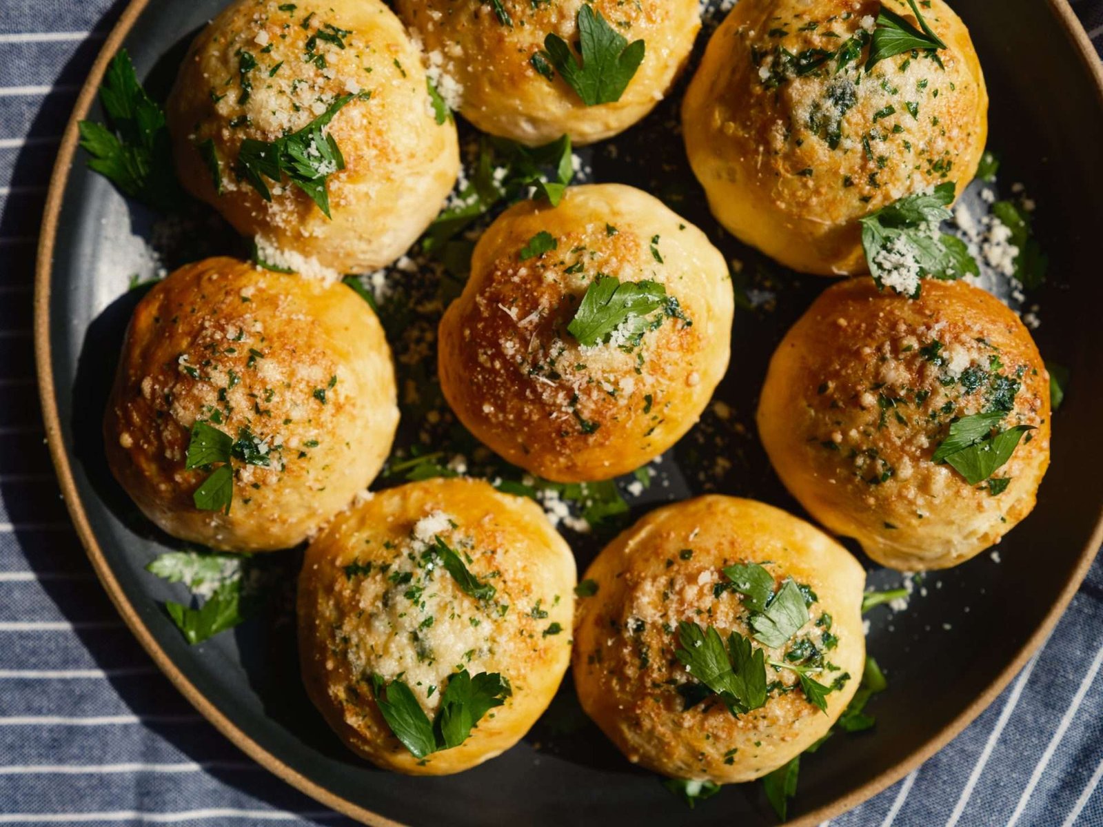 Placez sur la plaque préparée. Badigeonnez le dessus avec le beurre fondu mélangé à du persil frais et saupoudrez de parmesan râpé.
